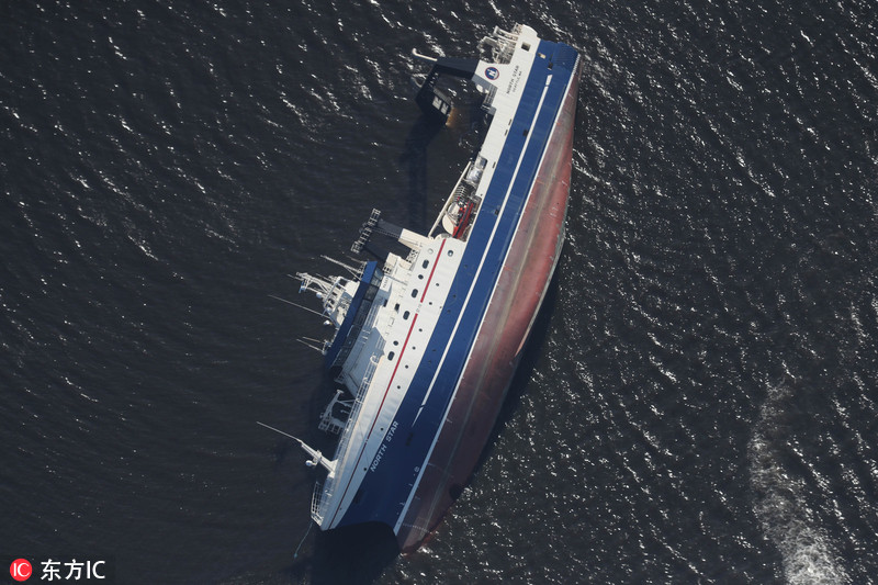 当地时间2018年10月11-12日,美国佛罗里达州巴拿马城,飓风“迈克尔”席卷当地大秀威力,一辆轮船被掀翻倾覆。