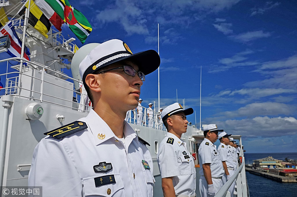 当地时间2018年10月12日,中国海军和平方舟医院船缓缓驶进多米尼克首都罗索港时,海军官兵在甲板列队站坡。