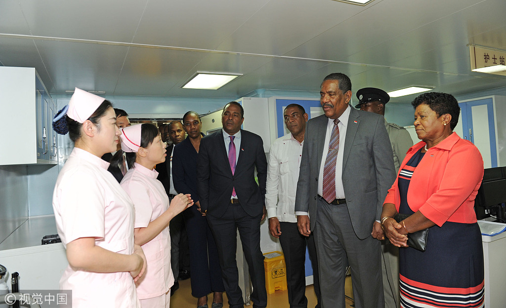 当地时间2018年10月12日,多米尼克首都罗索港,多总统查尔斯·萨瓦林(H.E. Charles Savarin)(右二)携夫人参观中国海军和平方舟医院船病房。