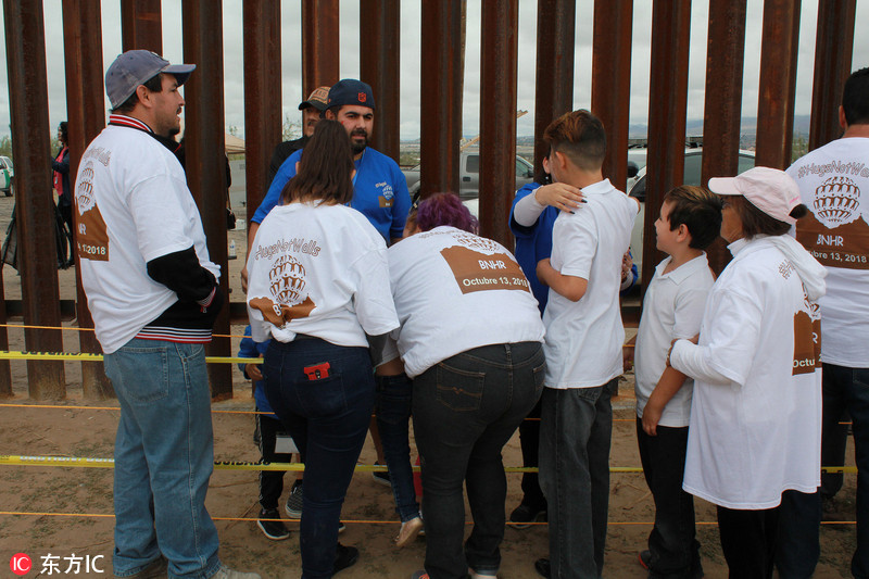当地时间2018年10月13日,墨西哥华雷斯城(Ciudad Juarez),墨西哥华雷斯城和美国桑兰公园之间的边境墙短暂打开,约3000名生活在美国的移民和他们的墨西哥人亲属获三分钟的团聚时间。