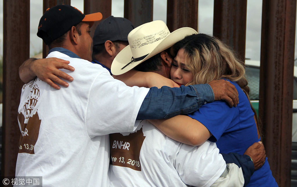 当地时间2018年10月13日,墨西哥华雷斯城(Ciudad Juarez),墨西哥华雷斯城和美国桑兰公园之间的边境墙短暂打开,约3000名生活在美国的移民和他们的墨西哥人亲属获三分钟的团聚时间。