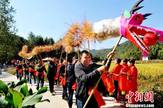 时下是当地中晚水稻收割的黄金季,在江西省德兴市海口镇杜村,当地村民自发用稻草编扎了一条既节俭又传统的稻草龙,走村串户来到田间地头舞动祥龙喜庆丰收。 卓忠伟 摄