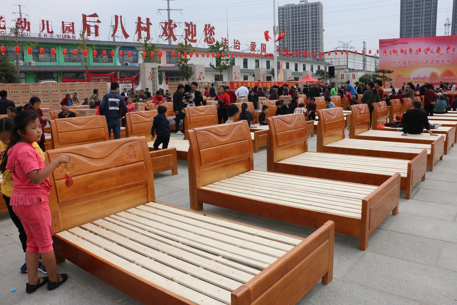 10月14日,山东济宁。重阳节来临之际,山东省邹城市后八里沟村自掏腰包购买了五百余张实木床并配备健康舒适的床垫,免费发放给村里老人,迎接重阳节。(来源:视觉中国)