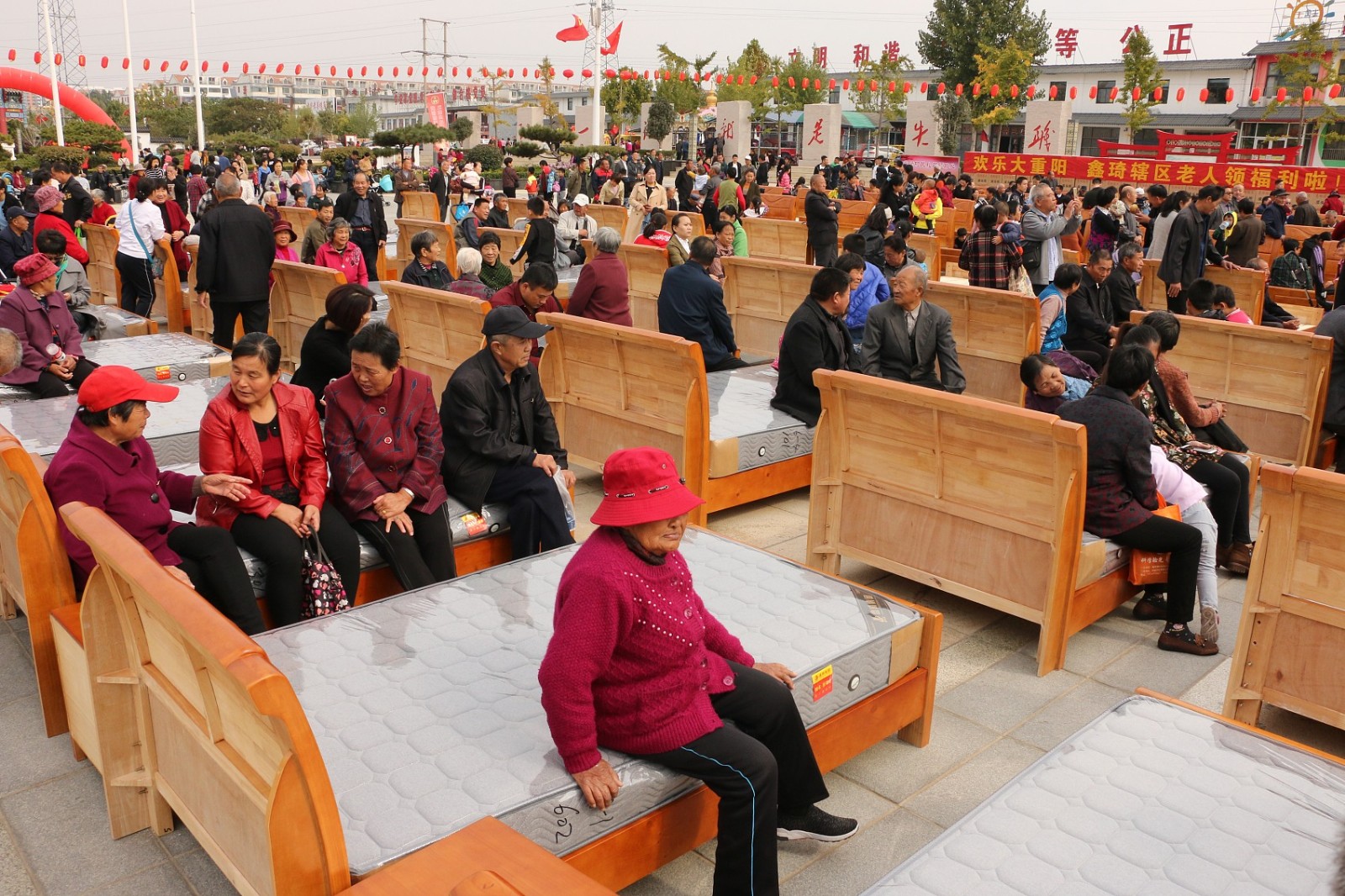 10月14日,山东济宁。重阳节来临之际,山东省邹城市后八里沟村自掏腰包购买了五百余张实木床并配备健康舒适的床垫,免费发放给村里老人,迎接重阳节。(来源:视觉中国)