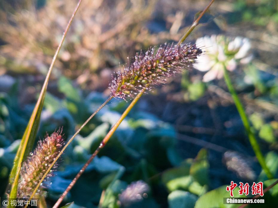 10月15日,在长春一公园内,路边的花草裹上了一层白色的霜冻。当日,长春最低温度跌倒破冰点。席海波 摄