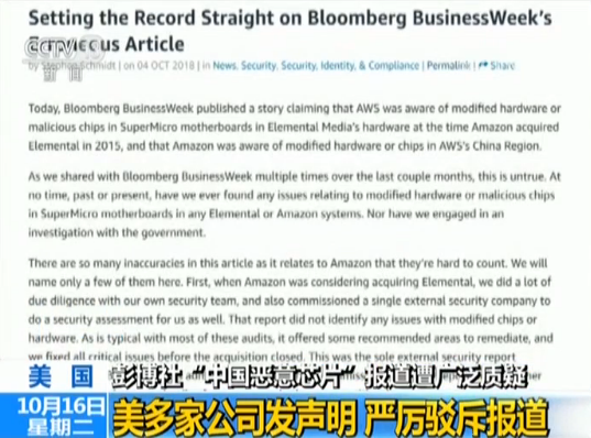 南加州大学跨国法律贸易中心主任 布莱恩·派克:基于苹果、亚马逊、超微三家公司的强烈否认,这篇文章是不准确的,信息来源也是错误的。我认为这很简单,事实是三家公司予以强烈否认。我认为这是(彭博社)记者们想要追踪报道一个大新闻,但是他们的报道基于错误的信息。