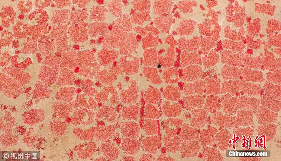 近日,深秋过后,随着一片片火红的辣椒,在新疆库车县国道217线两旁戈壁滩铺成大小不一的晾晒场,连绵数公里,如红色地毯。由于戈壁滩受高温和风向等影响,地面比较干燥和炎热,是让辣椒自然脱水变成辣椒干(俗称“辣皮子”)的最好原生态措施,因此各族群众喜欢把辣椒晾晒在戈壁滩上。通过无人机从高空向下俯视,辣椒组成的大大小小、纵横阡陌的色块和条纹交织在一起,宛如一幅鬼斧神工的印象派画作。 图片来源:视觉中国