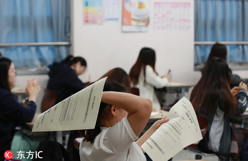 当地时间2018年10月16日,韩国首尔,高三学生正在参加今年高考前的最后一次全国模拟考试。2019学年大学修学能力考试(高考)将于今年11月15日进行。