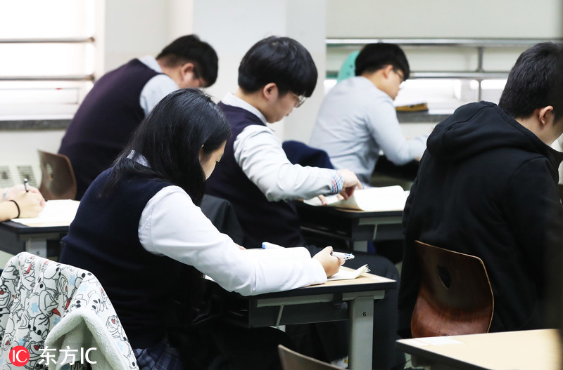 当地时间2018年10月16日,韩国首尔,高三学生正在参加今年高考前的最后一次全国模拟考试。2019学年大学修学能力考试(高考)将于今年11月15日进行。