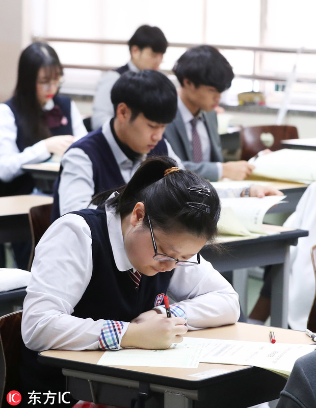 当地时间2018年10月16日,韩国首尔,高三学生正在参加今年高考前的最后一次全国模拟考试。2019学年大学修学能力考试(高考)将于今年11月15日进行。