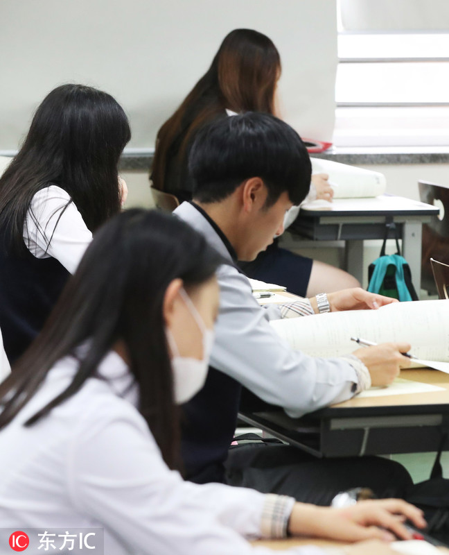 当地时间2018年10月16日,韩国首尔,高三学生正在参加今年高考前的最后一次全国模拟考试。2019学年大学修学能力考试(高考)将于今年11月15日进行。