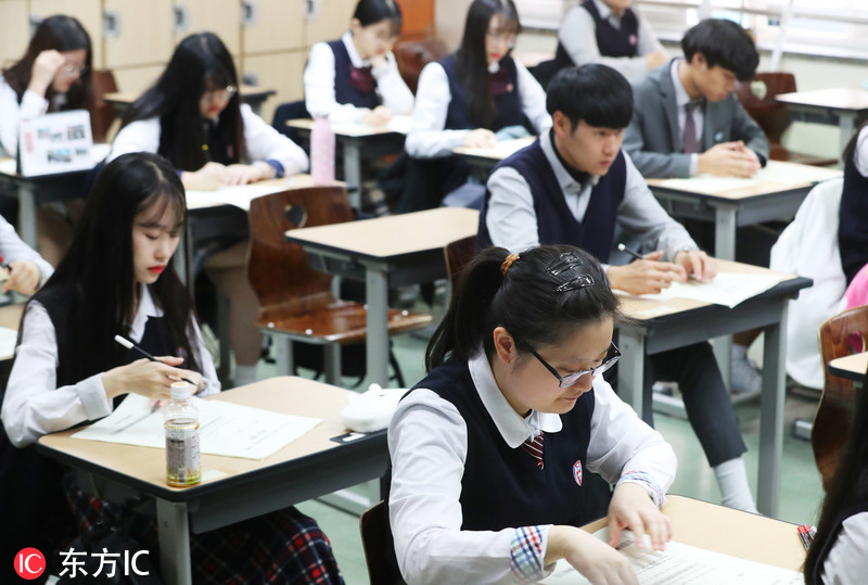 当地时间2018年10月16日,韩国首尔,高三学生正在参加今年高考前的最后一次全国模拟考试。2019学年大学修学能力考试(高考)将于今年11月15日进行。