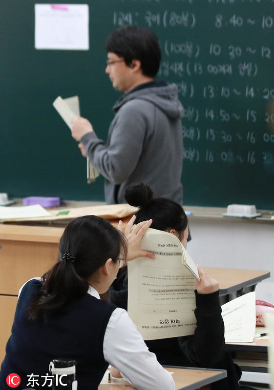 当地时间2018年10月16日,韩国首尔,高三学生正在参加今年高考前的最后一次全国模拟考试。2019学年大学修学能力考试(高考)将于今年11月15日进行。