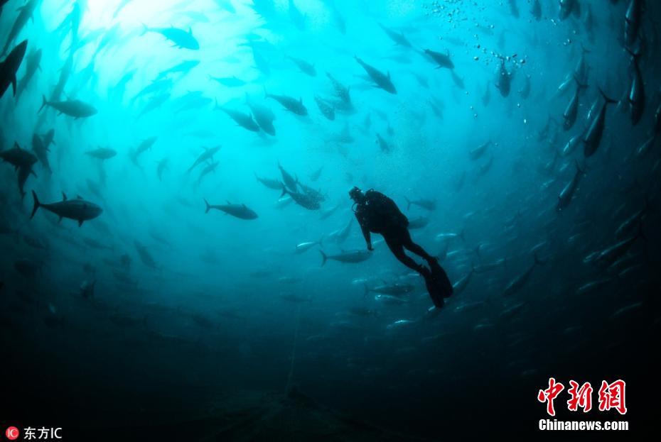 当地时间10月14日,土耳其伊兹密尔,实拍当地金枪鱼养殖渔场,潜水员潜入深海喂鱼。这家养殖场饲养着约1500只金枪鱼。