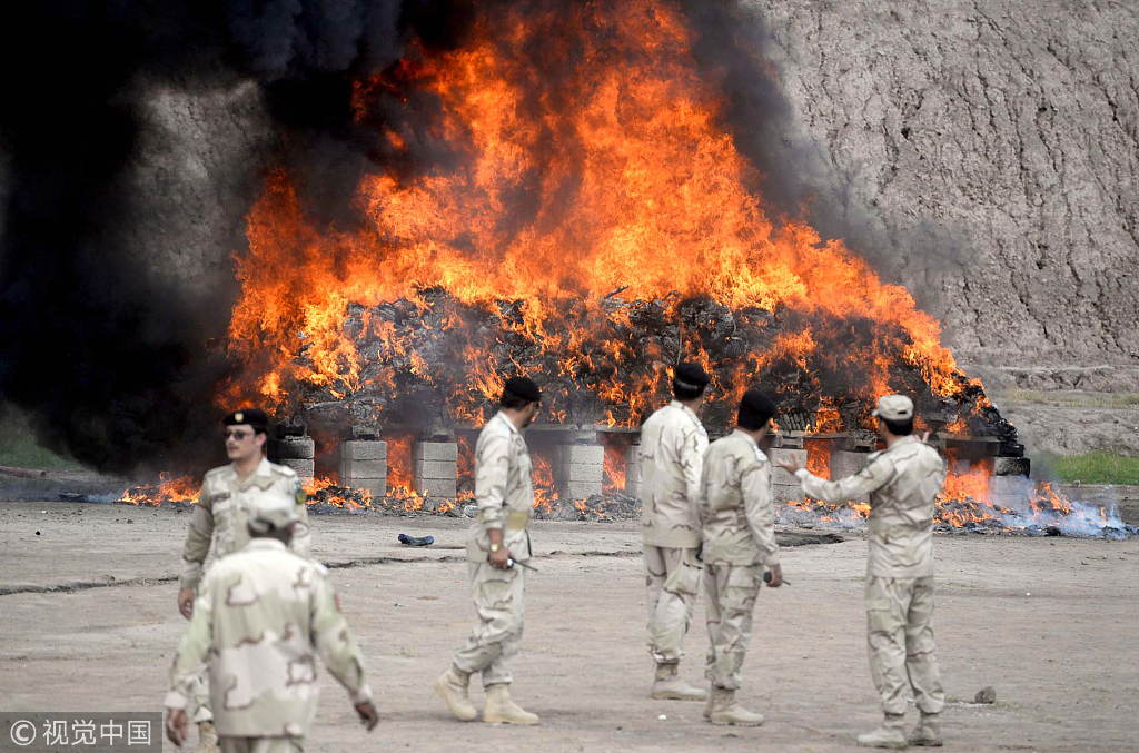 当地时间2018年10月16日,巴基斯坦白沙瓦,巴基斯坦缉毒警察焚烧查获的数吨毒品。