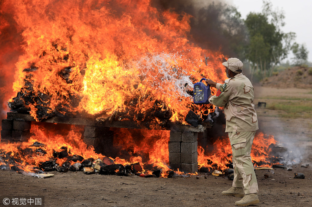 巴基斯坦缉毒警察焚烧数吨毒品 现场火光汹涌