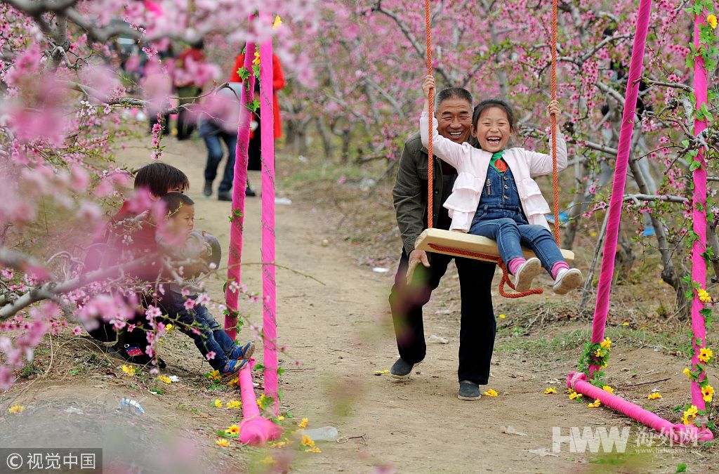 2016年4月3日,山西运城,万荣一位爷爷推着小孙女在开满桃花的桃园内荡秋千。