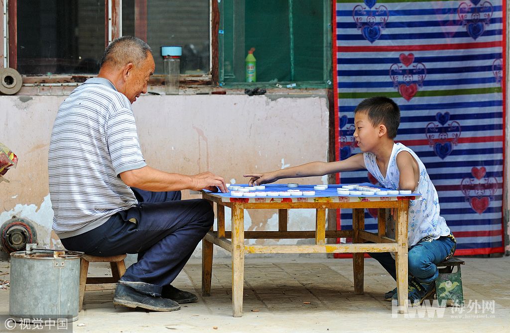 2015年7月18日,山西运城,芮城一位爷爷在和孙子下棋。