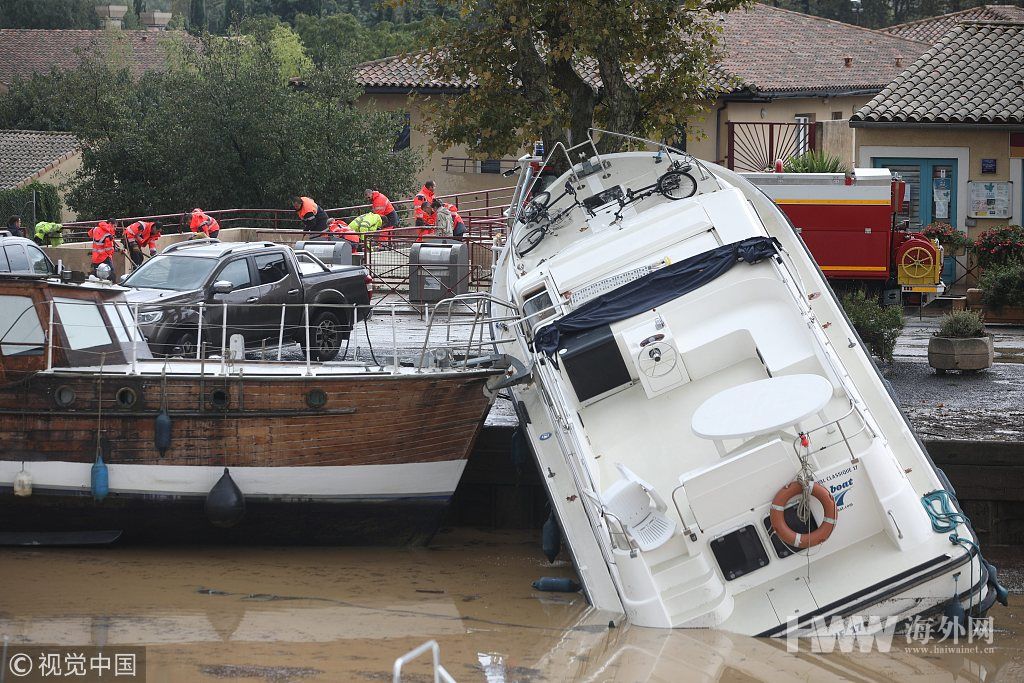 当地时间2018年10月16日,法国孔克,法国暴雨引发突发性水灾,洪水卷走了大量车辆,淹没了房屋,人员伤亡和财产损失惨重。