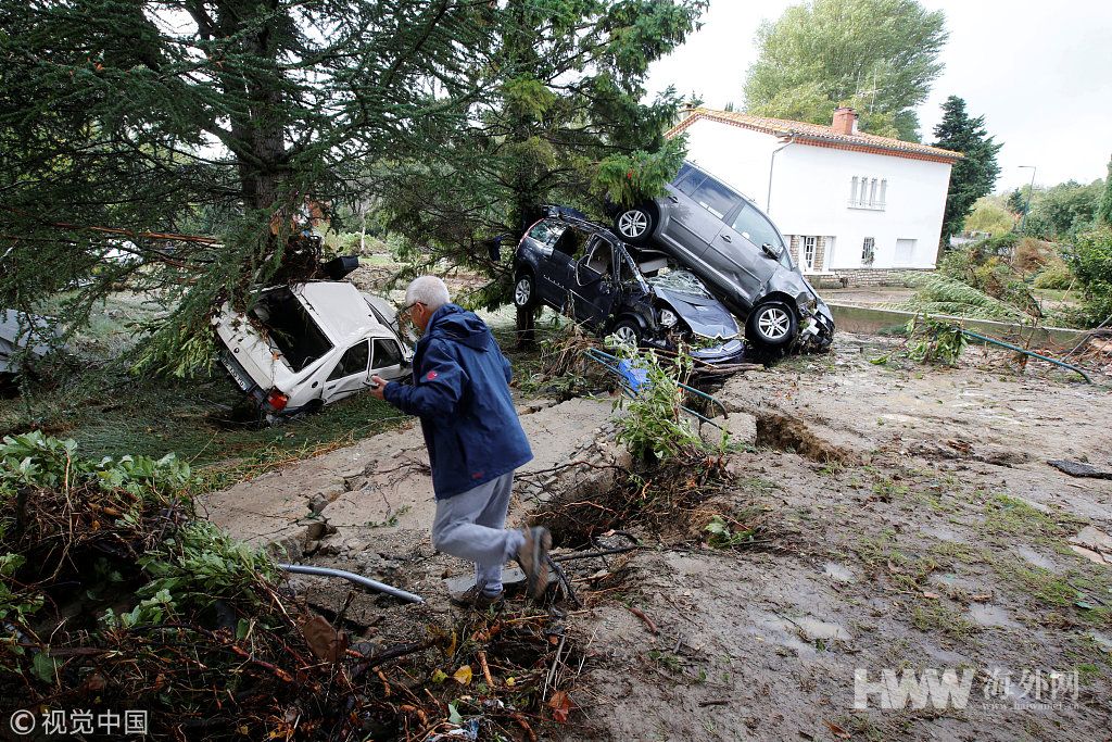 当地时间2018年10月16日,法国孔克,法国暴雨引发突发性水灾,洪水卷走了大量车辆,淹没了房屋,人员伤亡和财产损失惨重。
