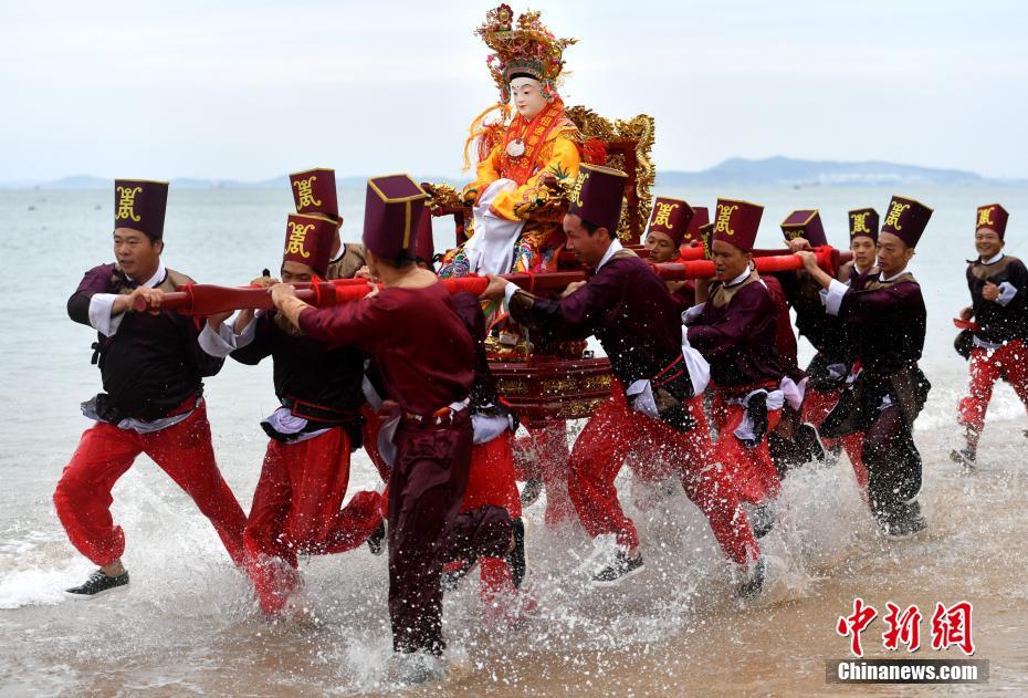 10月17日,农历戊戌年九月初九,是“海上和平女神”妈祖羽化升天的纪念日。“妈祖故里”福建湄洲岛在深澳底沙滩举办纪念妈祖羽化升天1031周年纪念活动暨海峡两岸共同海祭妈祖典礼。图为福建宁德霞浦竹江前澳天后宫信众表演传统习俗——“阿婆走水”。中新社记者 吕明 摄