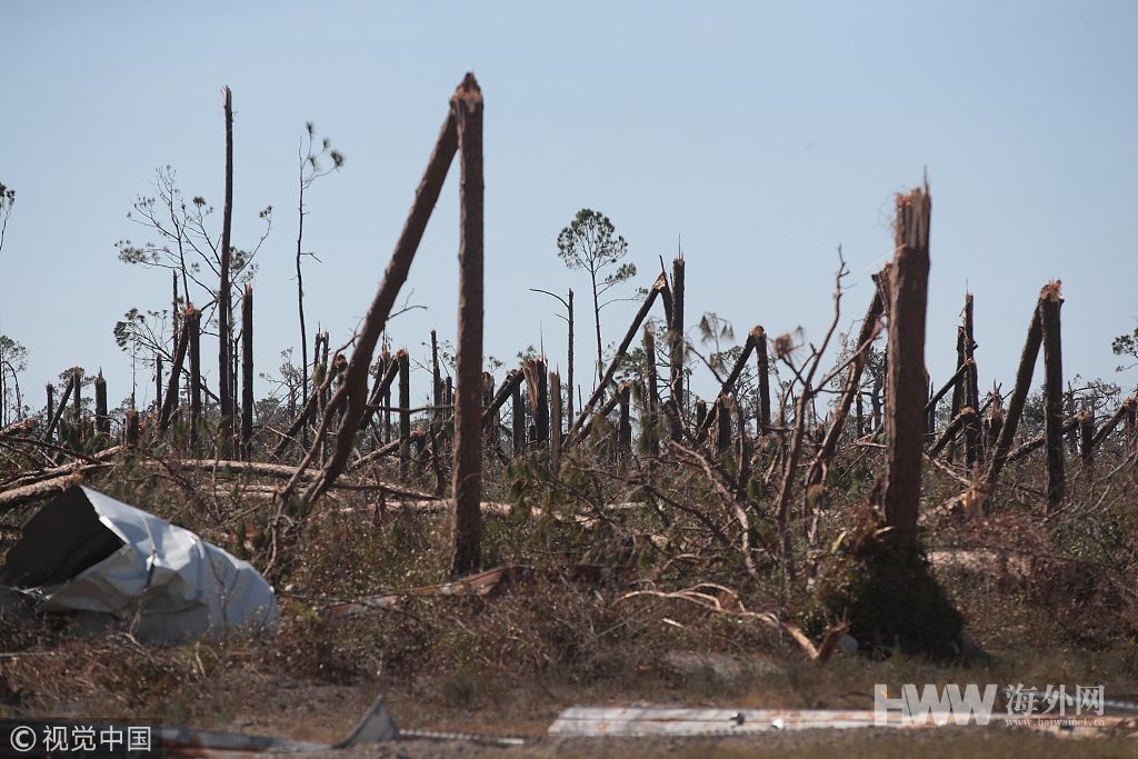 当地时间2018年10月17日,美国佛罗里达州巴拿马城,飓风“迈克尔”过境后,当地一片废墟,善后工作持续进行。