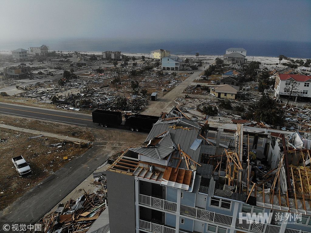 当地时间2018年10月17日,美国佛罗里达州墨西哥滩,飓风“迈克尔”过境后,当地一片废墟,善后工作持续进行。