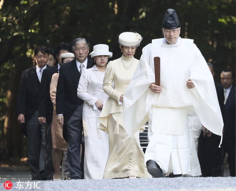 当地时间2018年10月18日,日本三重县伊势市,绚子公主随母亲宪仁亲王妃久子现身伊势神宫进行参拜,以报告自己将成婚。10月29日,日本皇室高圆宫家的三女绚子公主将于航运公司普通职员守谷慧婚在明治神宫举行婚礼。