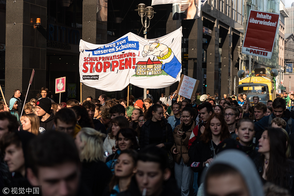 当地时间2018年10月18日,德国柏林,当地数百名学生组织罢课游行,呼吁建立公平、自主的教育体系。