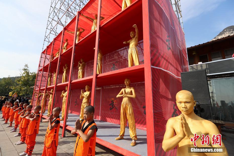 8.6万名武校学生在河南登封8.2公里的展演路线上展示旗阵、“千人”组字阵、百态功法展示等十大武术矩阵。 中新社记者 王中举 摄