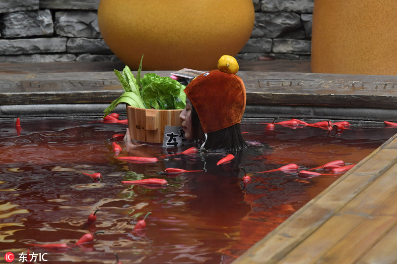2018年10月19日,重庆,一景区推出“火锅温泉”,形状就像火锅的锅,还有分格。里面的水也是红色的,水面上还浮着很多辣椒。有网友调侃说只有重庆人才敢去泡。 游客在火锅里泡温泉。来源:东方IC