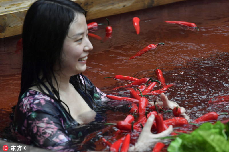 2018年10月19日,重庆,一景区推出“火锅温泉”,形状就像火锅的锅,还有分格。里面的水也是红色的,水面上还浮着很多辣椒。有网友调侃说只有重庆人才敢去泡。 游客在火锅里泡温泉。来源:东方IC