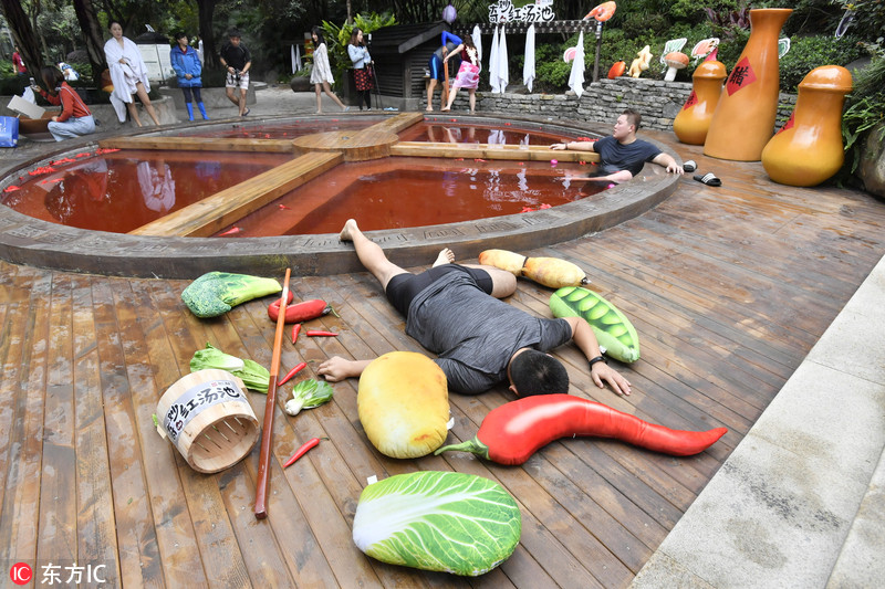 2018年10月19日,重庆,一景区推出“火锅温泉”,形状就像火锅的锅,还有分格。里面的水也是红色的,水面上还浮着很多辣椒。有网友调侃说只有重庆人才敢去泡。 游客在火锅里泡温泉。来源:东方IC