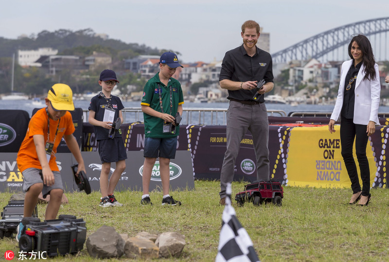 当地时间2018年10月20日,澳大利亚悉尼鹦鹉岛,正在该国访问的英国哈里王子夫妇观看“永不屈服运动会”第一日赛事,并和小萌娃一起尝试遥控赛车,期间,哈里王子“技艺不精”不慎翻车。来源:东方IC
