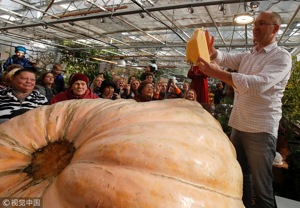 当地时间2018年10月20日,俄罗斯莫斯科,当地举行南瓜切割仪式,民众见证一颗重达645公斤的大西洋巨型南瓜被切割。
