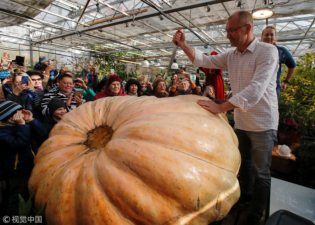 当地时间2018年10月20日,俄罗斯莫斯科,当地举行南瓜切割仪式,民众见证一颗重达645公斤的大西洋巨型南瓜被切割。