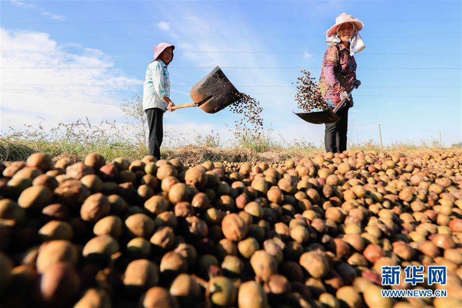 10月21日,江苏省淮安市盱眙县穆店镇农民在翻晒收获的芡实。 新华社发(周海军 摄)
