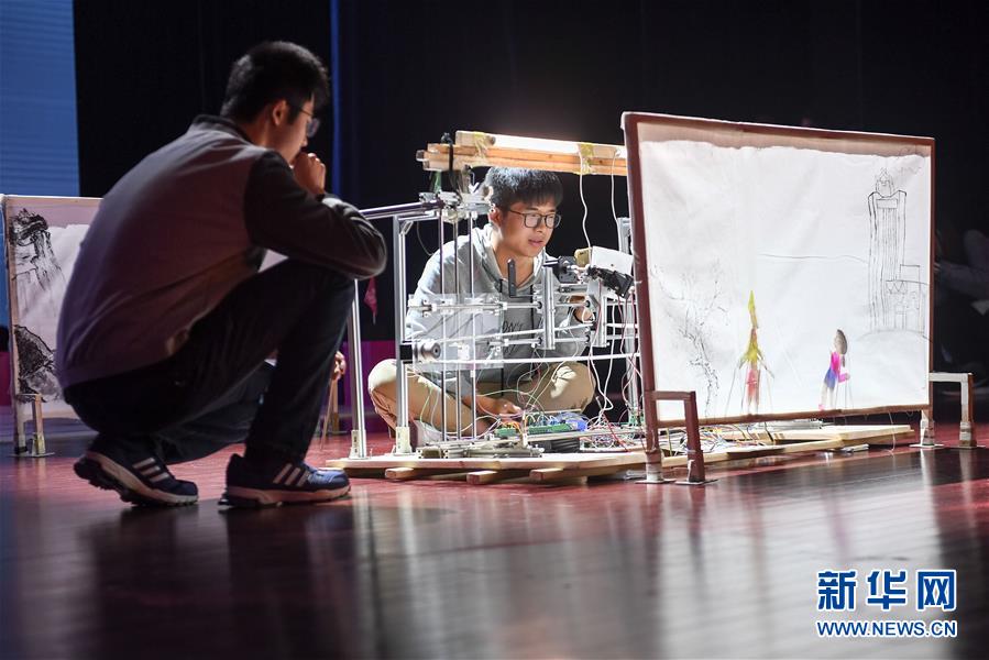 10月21日,在位于安徽合肥的中国科学技术大学,“人五成影”队带着皮影戏机器人参加比赛。  新华社记者张端摄