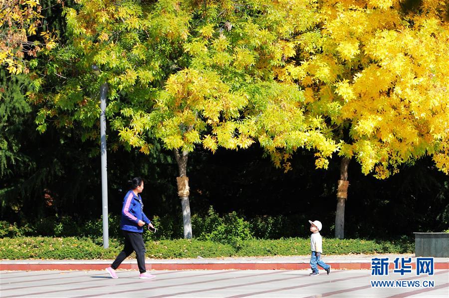 10月17日,市民在山东青岛西海岸新区双珠公园踏秋。 新华社发(王培珂 摄)