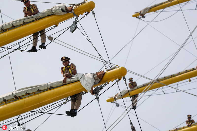 印尼海军风帆训练舰抵菲访问 船员齐“挂”桅杆蔚为壮观