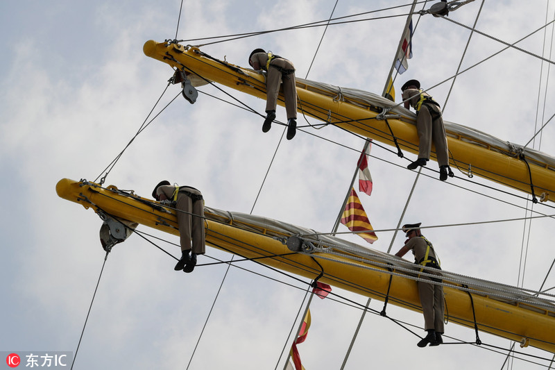 印尼海军风帆训练舰抵菲访问 船员齐“挂”桅杆蔚为壮观