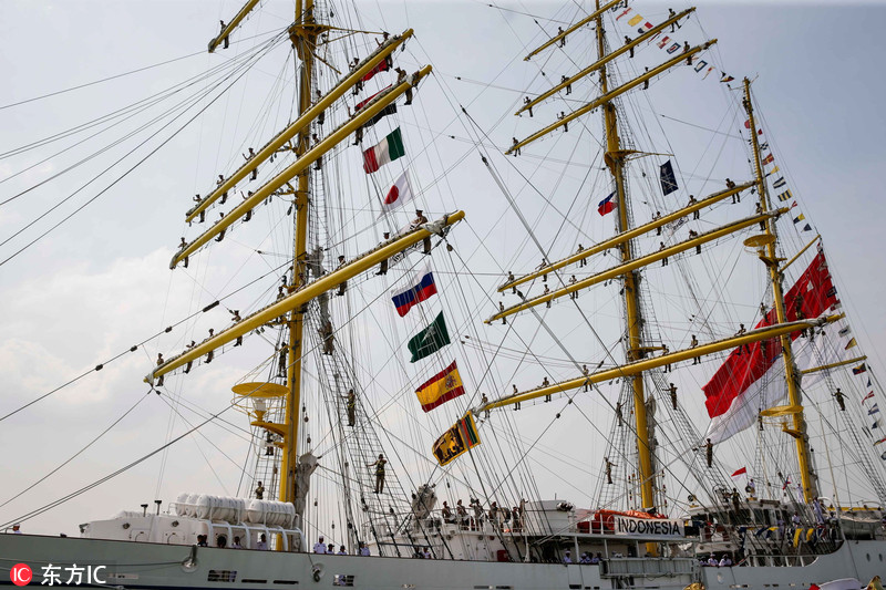 印尼海军风帆训练舰抵菲访问 船员齐“挂”桅杆蔚为壮观