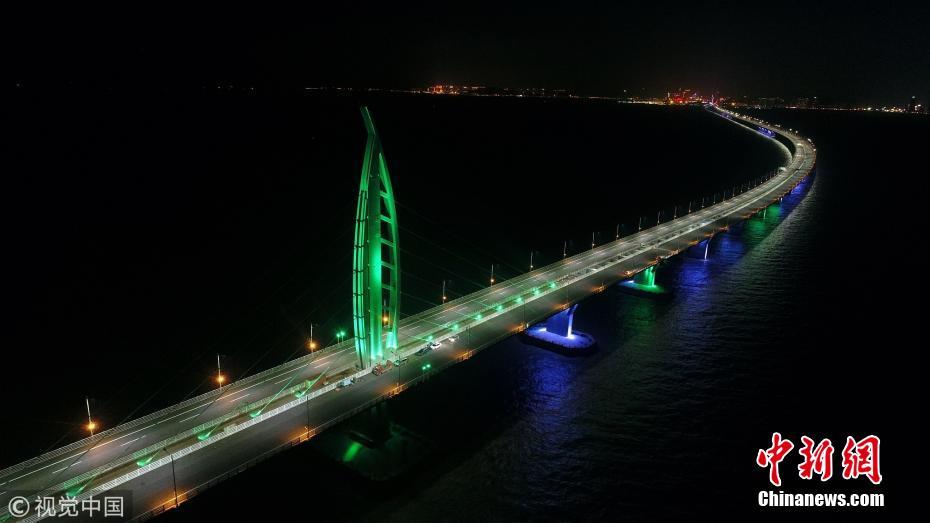 2017年12月30日,珠海,港珠澳大桥九洲航道桥、江海直达船航道桥灯火璀璨,在五颜六色的装饰灯映衬下,整座大桥熠熠生辉。王荣 摄