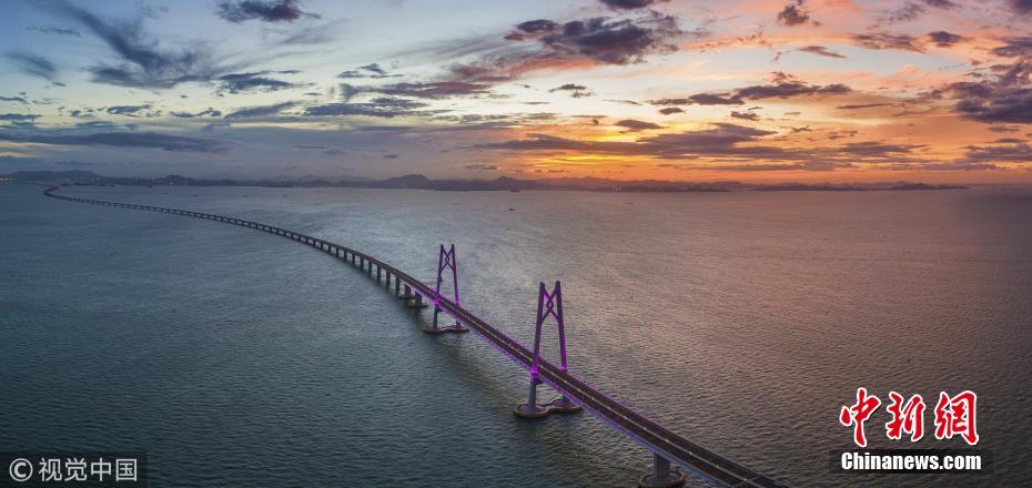 2018年7月18日,珠海,满天红霞,亮灯后的港珠澳大桥跨立在伶仃洋上,进入通车前的最后准备。张由琼 摄