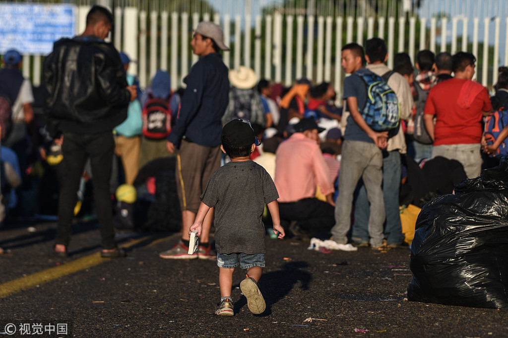 当地时间2018年10月22日,危地马拉Ciudad Tecun Uman,洪都拉斯移民等待从边境入境墨西哥,借道墨西哥前往美国。