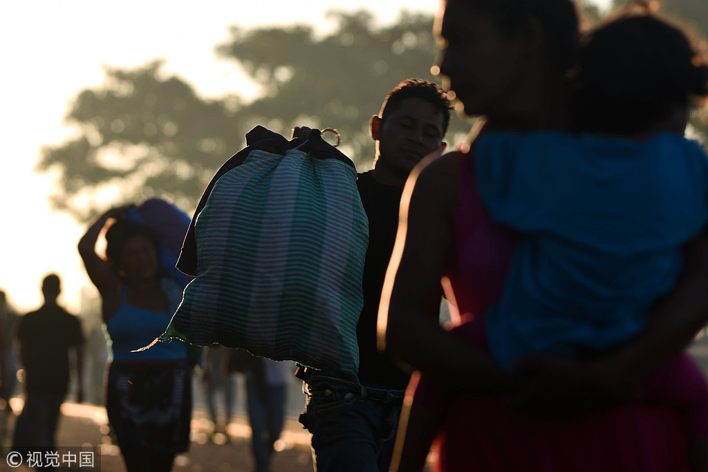 当地时间2018年10月22日,危地马拉Ciudad Tecun Uman,洪都拉斯移民等待从边境入境墨西哥,借道墨西哥前往美国。