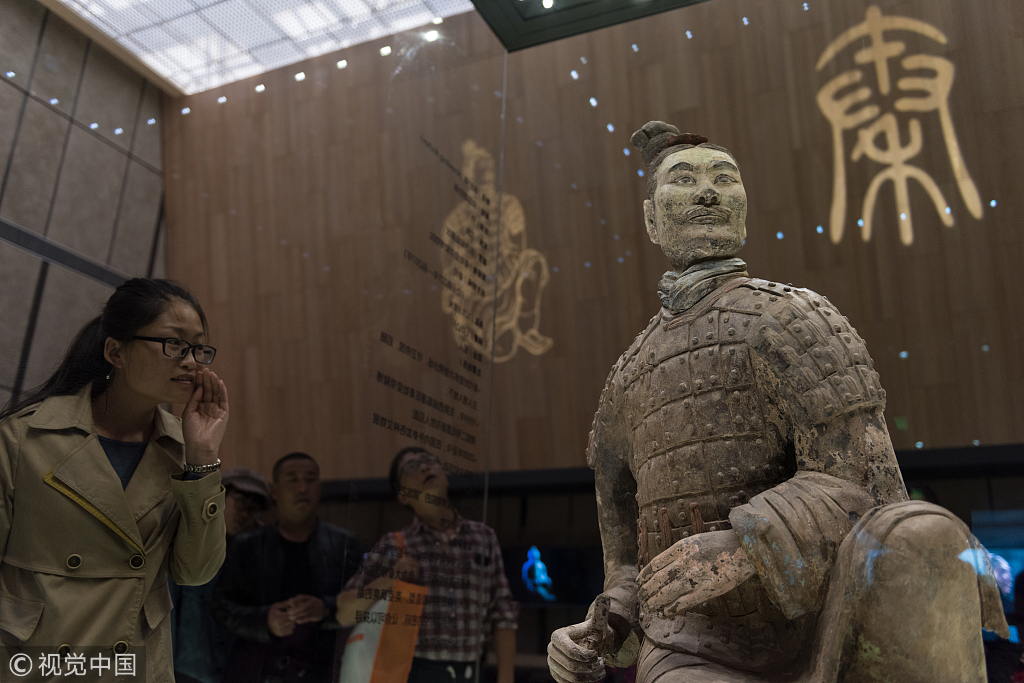 2018年10月23日,西安。此次展出的秦彩绘跪射俑是秦兵马俑中唯一发现的“绿脸”俑。