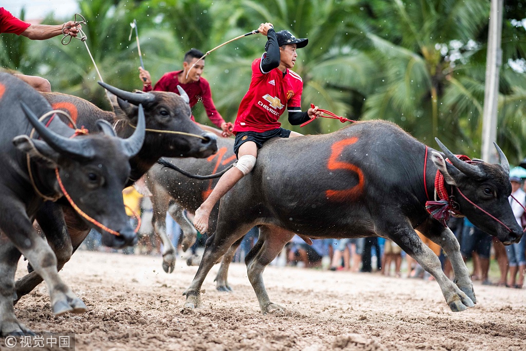 泰国举办传统水牛赛跑 选手骑牛狂奔惊险刺激