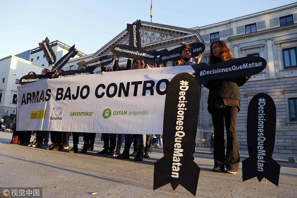 西班牙民众在议会大楼外抗议 要求停止向沙特出售武器