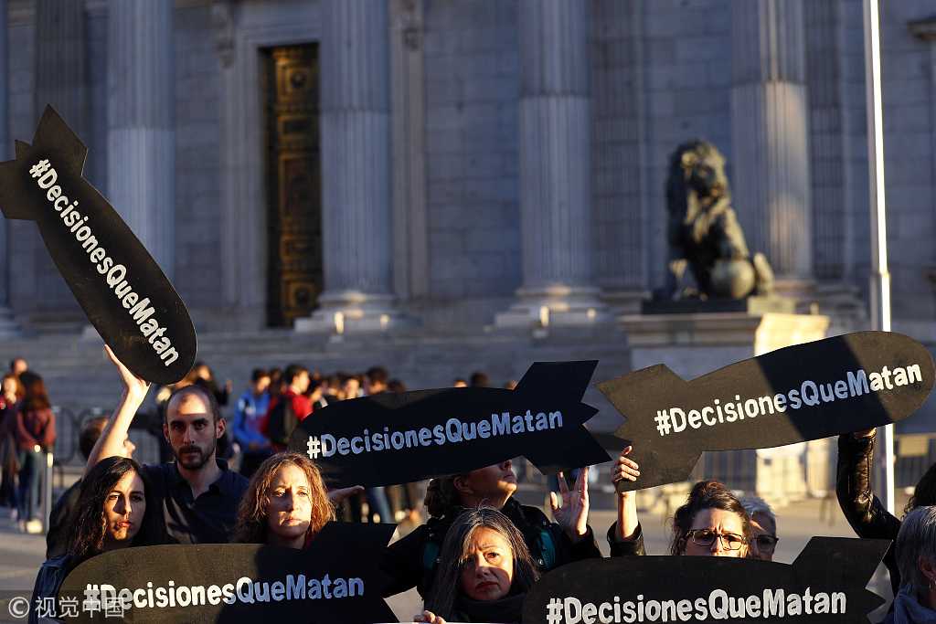 西班牙民众在议会大楼外抗议 要求停止向沙特出售武器